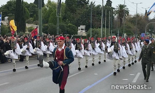 Οι παριστάμενοι αποθέωσαν, νωρίτερα, τους Εύζωνες, σε μια εξαιρετικά εντυπωσιακή αλλαγή φρουράς στο Μνημείο του Άγνωστου Στρατιώτη, με την μπάντα να παίζει το «Μακεδονία Ξακουστή».