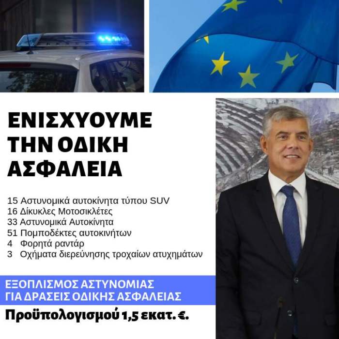 - 33 Αστυνομικά Αυτοκίνητα. Τα εν λόγω αυτοκίνητα αναμένεται να συμβάλλουν στην άμεση ανταπόκριση των αστυνομικών δυνάμεων. Πρόκειται για επιβατικά αυτοκίνητα, διασκευασμένα σε αστυνομικά αυτοκίνητα υπηρεσιακού και ελεύθερου χρωματισμού. Το κάθε όχημα θα πρέπει να είναι επιβατικό καινούργιο, σύγχρονης κατασκευής, αντιρρυπαντικής τεχνολογίας και κατάλληλο μορφολογικά για αστυνομικό αυτοκίνητο, για άνετη μεταφορά τουλάχιστον (4) ατόμων (συμπεριλαμβανομένου του οδηγού).