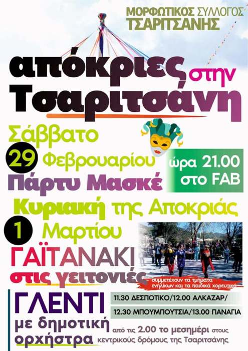 Αποκριάτικες εκδηλώσεις στην Τσαριτσάνη από τον Μορφωτικό Σύλλογο