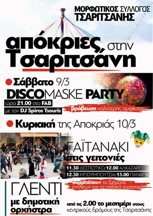 Όπως και να το κάνουμε Αποκριές χωρίς χορό δεν γίνεται, φορέστε την καλή σας διάθεση λοιπόν και ότι στολή επιθυμείτε και ελάτε στο DISCO/MASKE Party στο cafe/bar FAB στην Τσαριτσάνη.