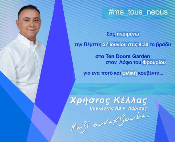 Ο βουλευτής ΝΔ Ν.Λάρισας,Χρήστος Κέλλας,διοργανώνει βραδιά επικοινωνίας για τους νέους και τις νέες του Ν.Λάρισας,την Πέμπτη 27/6 στις 9:30 μ.μ στο Ten Doors Garden στο Λόφο του Φρουρίου.