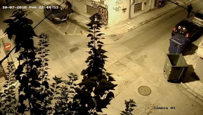 Ο δρόμος προς στιγμή είναι «καθαρός». Σε κλάσματα δευτερολέπτου στο βίντεο (πάνω αριστερά στην οθόνη) εμφανίζεται ένας άντρας ντυμένος στα μαύρα που φορά άσπρο καπέλο τύπου τζόκεϊ. Διασχίζει κάθετα την οδό Γαλλίας και με γρήγορες κινήσεις, ανεβαίνει το πεζοδρόμιο και μπαίνει μπροστά στην πόρτα του οδηγού από την οποία ετοιμάζεται να βγει από το ΙΧ του ο Βολιώτης αθλητικογράφος.