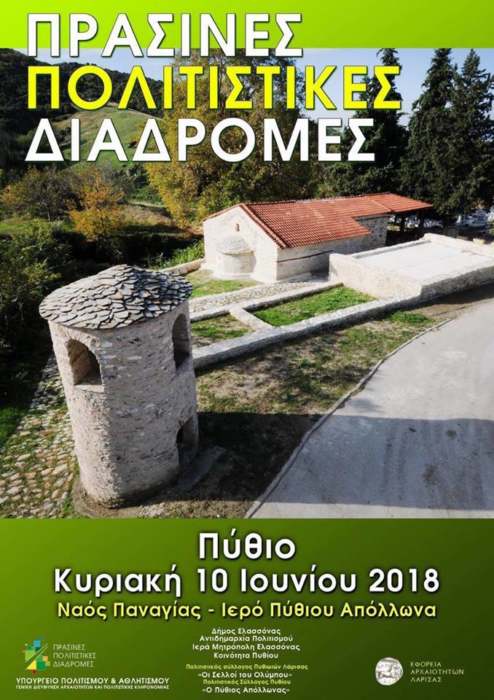 Η Εφορεία Αρχαιοτήτων Λάρισας στο πλαίσιο του θεσμού του Υπουργείου Πολιτισμού και Αθλητισμού «Πράσινες Πολιτιστικές Διαδρομές», διοργανώνει πολιτιστικό και περιβαλλοντικό περίπατο στο Πύθιο Ελασσόνας, την Κυριακή 10 Ιουνίου 2018 και ώρα 8.00-16.00.