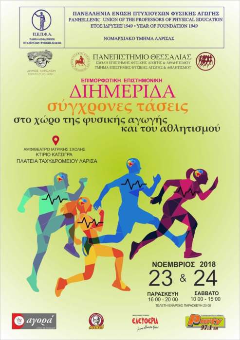 Η ΠΕΠΦΑ ν. Λάρισας, ο Δήμος Λαρισαίων, το Πανεπιστήμιο Θεσσαλίας και το ΤΕΦΑΑ Π.Θ. διοργανώνουν την 1η Επιμορφωτική επιστημονική διημερίδα με θέμα «Σύγχρονες τάσεις στο χώρο της φυσικής αγωγής και του αθλητισμού», που θα πραγματοποιηθεί στο αμφιθέατρο της Ιατρικής Σχολής στο κτίριο «Κατσίγρα» στη Λάρισα την Παρασκευή 23 και ώρα 16.00-20.00 και το Σάββατο 24 Νοεμβρίου και ώρα 10.00-15.00.