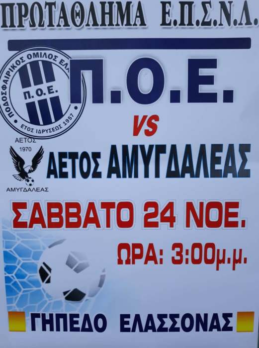 «Το διοικητικό συμβούλιο του ΠΟ Ελασσόνας, ο προπονητής και οι ποδοσφαιριστές απευθύνουν κάλεσμα στους φιλάθλους της πόλης και της ευρύτερης περιοχής, εν όψει του αγώνα με την Αμυγδαλέα, στο πλαίσιο της 10ης αγωνιστικής του πρωταθλήματος της Α’ ΕΠΣ Λάρισας.