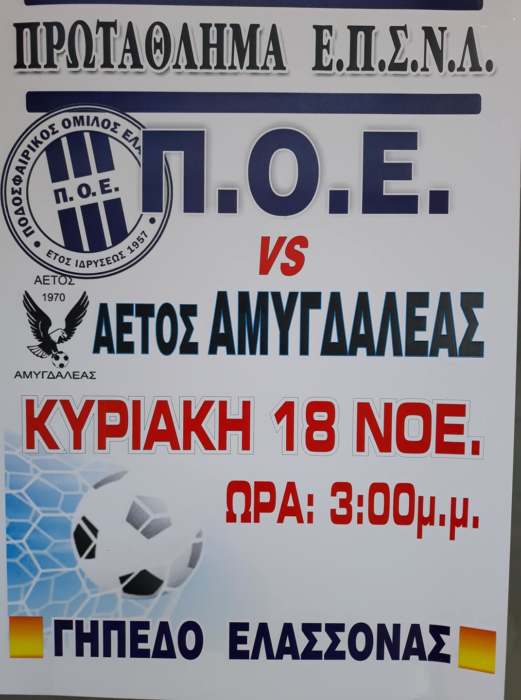 «Την Κυριακή 18 Νοεμβρίου, στις 3 το μεσημέρι πραγματοποιείται η επώμενη αγωνιστική της Α’ ΕΠΣΛ και ο Π.Ο.Ε. υποδέχεται τον Αετό Αμυγδαλέας .
