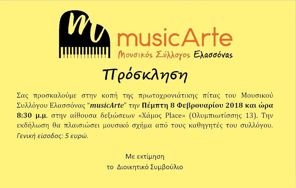 Σας προσκαλούμε στην κοπή της πρωτοχρονιάτικης πίτας του Μουσικού Συλλόγου Ελασσόνας “musicArte” την Πέμπτη 8 Φεβρουαρίου 2018 και ώρα 8:30 μ.μ. στην αίθουσα δεξιώσεων «Χάμος Place» (Ολυμπιωτίσσης 13).