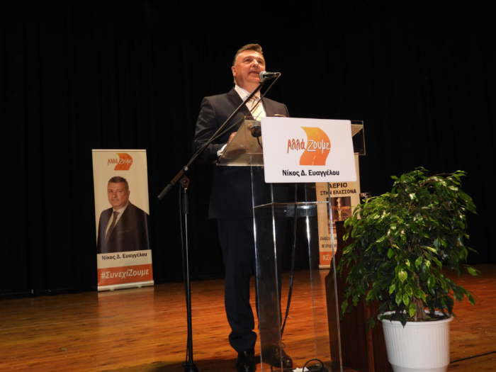 Στην κατάμεστη αίθουσα αλλά και των προαύλιων χώρων του θεάτρου Δημάρχου Βασίλη Φαρμάκη (λόγω βροχής), πραγματοποιήθηκε η κεντρική πολιτική εκδήλωση – ομιλία του Νίκου Ευαγγέλου. Ο Δήμαρχος Ελασσόνας και εκ νέου υποψήφιος, έκανε έναν απολογισμό του έργου του και παρουσίασε το πρόγραμμα και τους υποψηφίους.