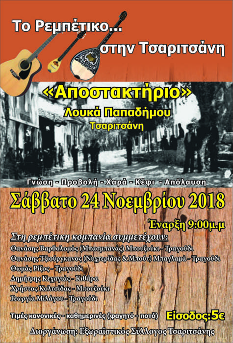 Σας προσκαλούμε το Σάββατο 24 Νοεμβρίου 2018,στην Τσαριτσάνη, στο Αποστακτήριο του Λουκά Παπαδήμου,να απολαύσουμε τη ρεμπέτικη κομπανία και το πρόγραμμά της,που επιμελήθηκαν ιδιαίτερα ο Θανάσης Βαρθολομός-Μπασμπανάς και ο Θανάσης Τζιούργκανος-Νυχτερίδας-Μπουτ