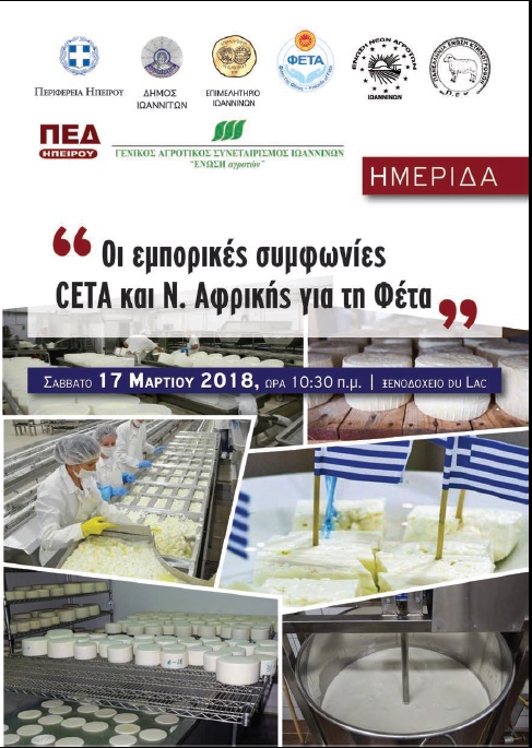 Η Περιφέρεια Ηπείρου σε συνεργασία με το Δήμο Ιωαννιτών, το Επιμελητήριο Ιωαννίνων, τον Όμιλο Φίλων Φέτας, την Πανελλήνια Ένωση Κτηνοτρόφων, τον Γενικό Αγροτικό Συνεταιρισμό Ιωαννίνων «ΕΝΩΣΗ Αγροτών» & την Ένωση Νέων Αγροτών Ιωαννίνων και την ΠΕΔ Ηπείρου, διοργανώνει ημερίδα στα Ιωάννινα, με θέμα: «Οι εμπορικές συμφωνίες CETA και Ν. Αφρικής για τη Φέτα».