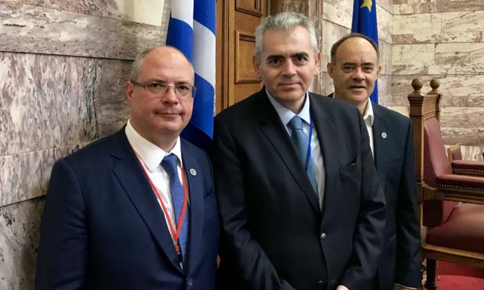 Φωτ. Ο Μάξιμος Χαρακόπουλος με τον νεοεκλεγέντα Ρώσο πρόεδρο της ΔΣΟ Sergey Gavrilov, και τον Έλληνα Γενικό Γραμματέα Ανδρέα Μιχαηλίδη.