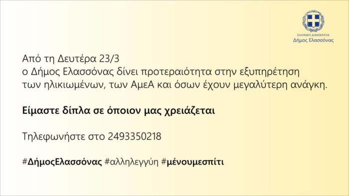 Οι άνθρωποι του Δήμου Ελασσόνας, πιστοί στο καθήκον που τους έχει αναθέσει η Ελληνική πολιτεία, θα βρίσκονται καθημερινά δίπλα στον κάθε πολίτη παρέχοντας όλες τις υπηρεσίες αιχμής.