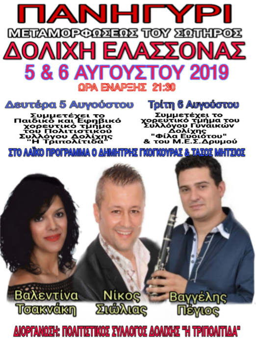 Δευτέρα 5 Αυγούστου μέγας εσπερινός και δημοτικό πανηγύρι με τους Νίκος Σιωλια και Βαλεντινα Τσακνακη στο τραγούδι και τον Βαγγέλη Πέγιο στο κλαρίνο