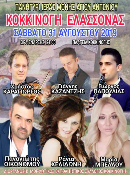 Ο Μορφωτικός Εκπολιτιστικός Σύλλογος Κοκκινόγης Ελασσόνας διοργανώνει στα πλαίσια του εορτασμού της Ιεράς Μονής Αγίου Αντωνίου μουσικοχορευτική εκδήλωση το Σάββατο 31 Αυγούστου και ώρα 9 το βράδυ στην πλατεία του χωριού.
