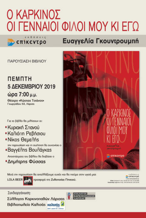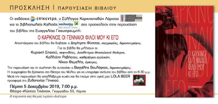 Σήμερα η παρουσίαση του βιβλίου της Ευαγγελίας Γκουντουμπή «Ο καρκίνος, οι γεννναίοι φίλοι μου κι εγώ» στις 7 μ.μ στο Θέατρο «Κώστας Τσιάνος» (πρώην θέατρο Μύλου)