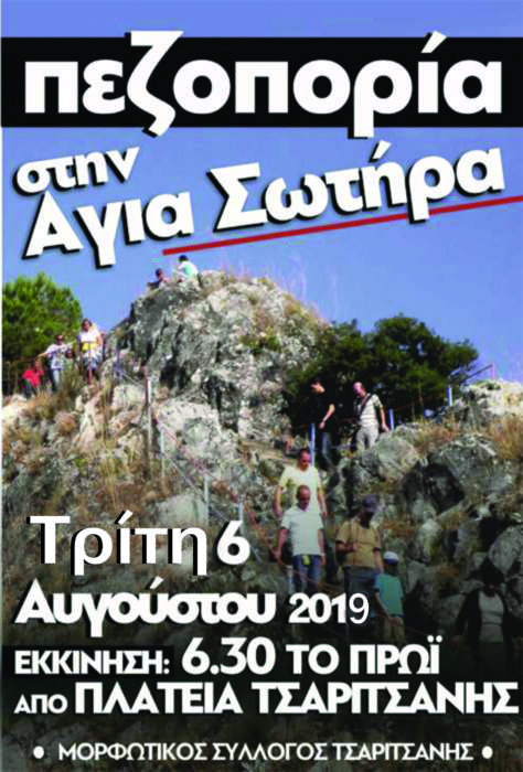 Πεζοπορία στην Αγια-Σωτήρα την Τρίτη 6 Αυγούστου διοργανώνει ο Μορφωτικός Σύλλογος Τσαριτσάνης