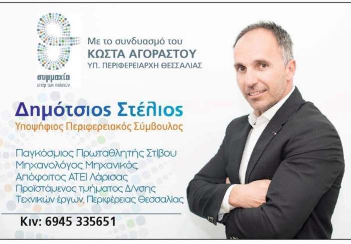 Στις Περιφερειακές εκλογές ψηφίζουμε Δημότσιο Στέλιο, υποψήφιο περιφερεικό σύμβουλο Λάρισας με τον συνδυασμό “Συμμαχία υπέρ των πολιτών” και υποψήφιο Περιφερειάρχη τον Κώστα Αγοραστό.