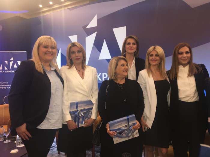 Στη μια άκρη η Στέλλα Μπίζου. Στην άλλη η Ευαγγελία Λανάρα. Και στη μέση οι γαλάζιες Άννα Καραμανλή, Σοφία Βούλτεψη, Κατερίνα Μάρκου και Έλενα Ράπτη.