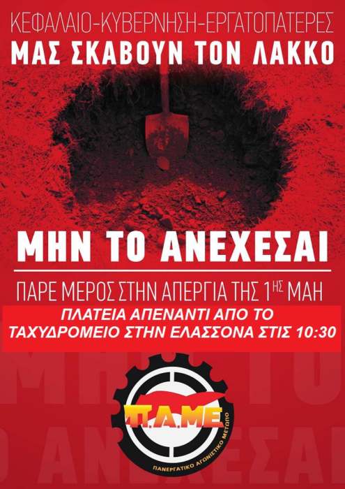 ΟΛΟΙ ΣΤΗΝ ΑΠΕΡΓΙΑΚΗ ΣΥΓΚΕΝΤΡΩΣΗ ΣΤΙΣ 10:30 ΣΤΗΝ ΠΛΑΤΕΙΑ ΑΠΕΝΑΝΤΙ ΑΠΟ ΤΟ ΤΑΧΥΔΡΟΜΕΙΟ ΣΤΗΝ ΕΛΑΣΣΟΝΑ