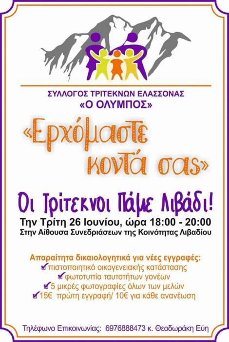 “Ερχόμαστε κοντά σας” αυτό είναι το σλόγκαν με το οποίο ο Σύλλογος Τριτέκνων Ελασσόνας ξεκινάει περιοδεία με στόχο την ανανέωση και την εγγραφή νέων μελών. Πρώτος σταθμός το Λιβάδι, δείτε το δελτίο τύπου: