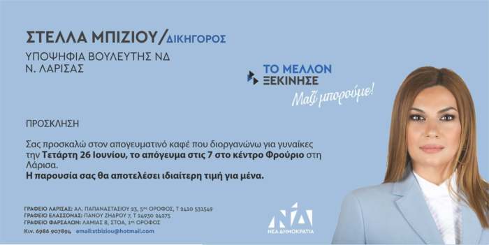 Σήμερα Τετάρτη 26 Ιουνίου από τις 19:00 η υποψήφια βουλευτής με τη ΝΔ κ. Στεργιανή (Στέλλα) Μπίζιου υποδέχεται γυναίκες στο κέντρο Φρούριο.