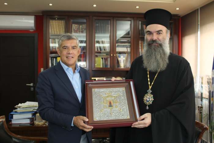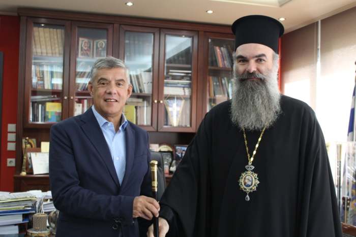 Στο πλαίσιο της επίσκεψης ο κ. Χαρίτωνας πρόσφερε στον Περιφερειάρχη εικόνα της Παναγίας  Ολυμπιώτισσας και τη δεσποτική του ράβδο.