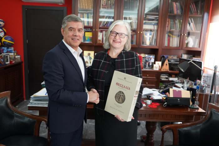 Στο τέλος της συνάντησης ο κ. Αγοραστός πρόσφερε στην Πρέσβη αναμνηστικά για την επίσκεψή της στη Θεσσαλία.
