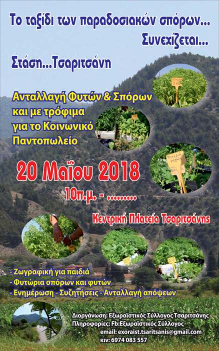 Καλούμε όλες τις ομάδες και τους φίλους να πάρουν ενεργά και δημιουργικά μέρος στις δραστηριότητες της ομάδας διάσωσης και διάδοσης παραδοσιακών –φυσικών σπόρων του Εξωραϊστικού Συλλόγου Τσαριτσάνης.
