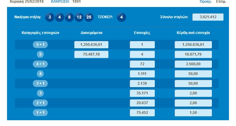 Ένα τυχερό δελτίο βρέθηκε στην 1η κατηγορία (5+1) κατά τη σημερινή διαλογή της 1891ηςκλήρωσης του ΤΖΟΚΕΡ που κερδίζει το ποσό των € 1.250.636,61.