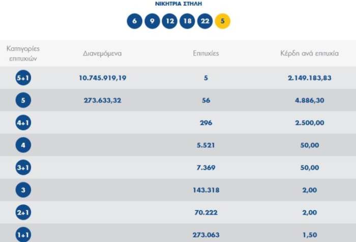 Σύμφωνα με όσα αναφέρει ο ΟΠΑΠ στο site του, πέντε τυχεροί «μάντεψαν» σωστά κι έτσι μοιράζονται το αστρονομικό ποσό!