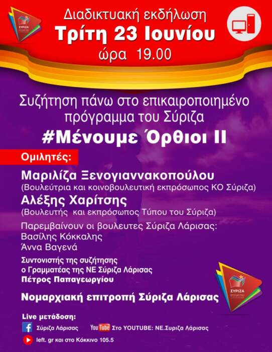 Η Νομαρχιακή Επιτροπή ΣΥΡΙΖΑ Λάρισας διοργανώνει τηλε – εκδήλωση για την παρουσίαση του προγράμματος «Μένουμε Όρθιοι ΙΙ» με ομιλητές τον εκπρόσωπο τύπου του κόμματος, βουλευτή, Αλέξη Χαρίτση και την κοινοβουλευτική εκπρόσωπο του ΣΥΡΙΖΑ, Μαριλίζα Ξενογιαννακοπούλου.