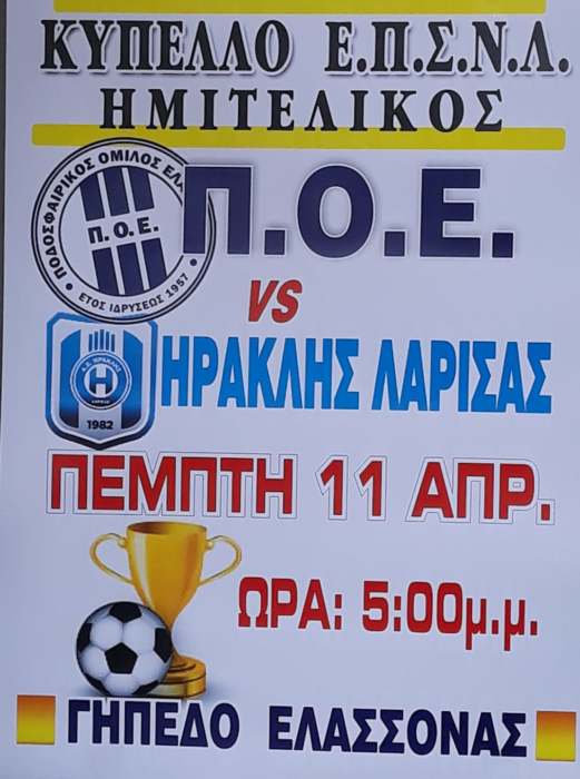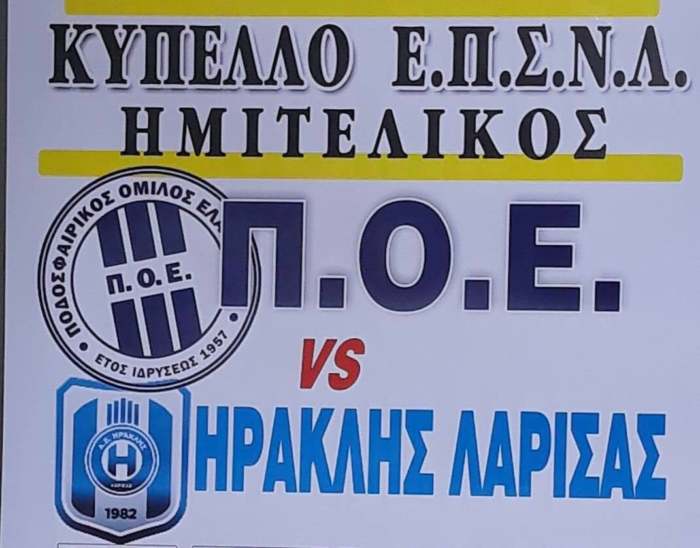Την ομάδα του Ηρακλή Λάρισας υποδέχεται ο ΠΟΕ στον ημιτελικό του κυπέλλου ΕΠΣΛ που θα πραγματοποιηθεί την Πέμπτη 11 Απριλίου και ώρα 17.00, στο γήπεδο Ελασσόνας.