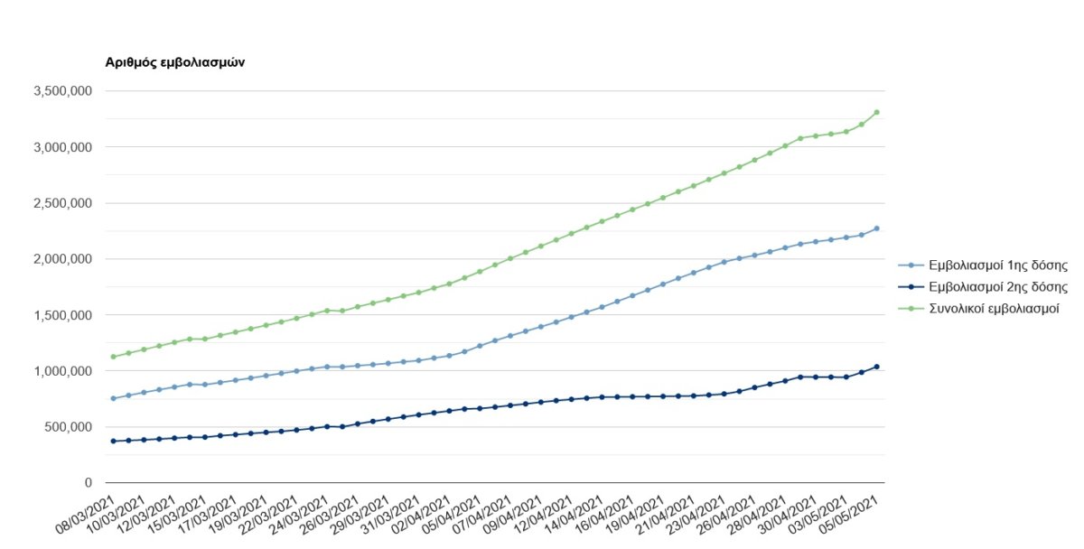 Πιο αναλυτικά, μέχρι χθες έχουν πραγματοποιηθεί συνολικά 3.309.788 εμβολιασμοί. Από αυτούς 2.272.659 αφορά εμβολιασμούς μιας δόσης και 1.037.129 εμβολιασμούς και με τις δυο δόσεις.