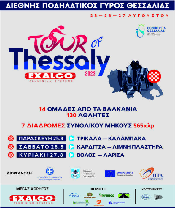 H Περιφέρεια Θεσσαλίας και η Ελληνική Ομοσπονδία Ποδηλασίας, υπό την εποπτεία της Βαλκανικής Ποδηλατικής Ένωσης (BCU) διοργανώνουν  από τις 25-27 Αυγούστου τον 1ο Διεθνή Ποδηλατικό Γύρο Θεσσαλίας Tour of Thessaly Exalco. Συνολικά 14 ομάδες από τα Βαλκάνια με  130 αθλητές θα διανύσουν 7 διαδρομές συνολικού μήκους 565 χιλιομέτρων, σε όλες τις Περιφερειακές Ενότητες της Θεσσαλίας, με «αιχμή του δόρατος» το Βαλκανικό Περιφερειακό Ποδηλατικό Πρωτάθλημα Δρόμου 2023 Ελίτ Ανδρών και Γυναικών (Elite+U23), Κατηγορίες Junior και Cadet.