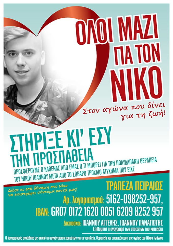 Όλοι μαζί λοιπόν μπορούμε να στηρίξουμε τον καθημερινό αγώνα που δίνει ο 20χρονος Νίκος!