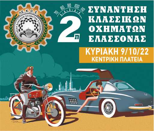 Η 2η Συνάντηση Κλασσικών Οχημάτων Ελασσόνας, αποτελεί σπουδαίο κοινωνικό, πολιτιστικό και τουριστικό γεγονός για την πόλη της Ελασσόνας και όλης της Επαρχίας, όπου οι επισκέπτες θα θαυμάσουν μοτοσυκλέτες και αυτοκίνητα μιας …άλλης εποχής, ενώ τα πληρώματα θα κάνουν διαδρομές στα ωραιότερα σημεία της επαρχίας, γνωρίζοντας τις ομορφιές του τόπου μας.