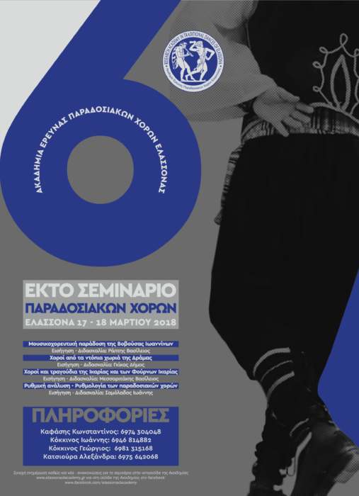 Η Ακαδημία Έρευνας Παραδοσιακών Χορών Ελασσόνας διοργανώνει το διήμερο 17/03/2018 – 18/03/2018 το 6ο σεμινάριο παραδοσιακών χορών με τη συμμετοχή καταξιωμένων χοροδιδασκάλων του είδους, ερευνητών – λαογράφων. Το σεμινάριο απευθύνεται σε δασκάλους παραδοσιακών χορών, χορευτές, μουσικούς και φίλους των παραδοσιακών χορών και της παραδοσιακής μουσικής γενικότερα.
