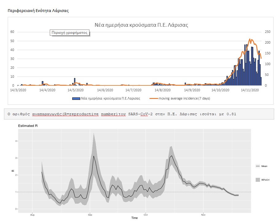Χαραμάδα αισιοδοξίας ωστόσο προκύπτει από τα στοιχεία της ημερήσιας κατανομής των επιβεβαιωμένων κρουσμάτων και ο αριθμός αναπαραγωγής R (R=reproductive number) για την Π.Ε της Λάρισας, όπως αυτά προκύπτουν από την Επιδημιολογική Έκθεση που συντάσσει το τμήμα Υγιεινής του πανεπιστημίου Θεσσαλίας.