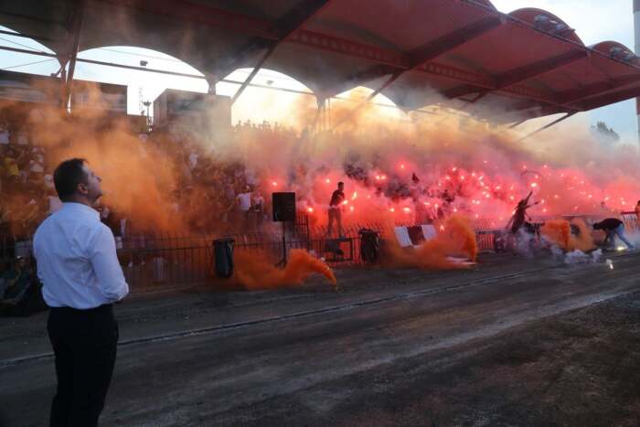 Οι οπαδοί των βυσσινί άναψαν καπνογόνα, φώναξαν συνθήματα δημιουργώντας μία όμορφη ατμόσφαιρα.
