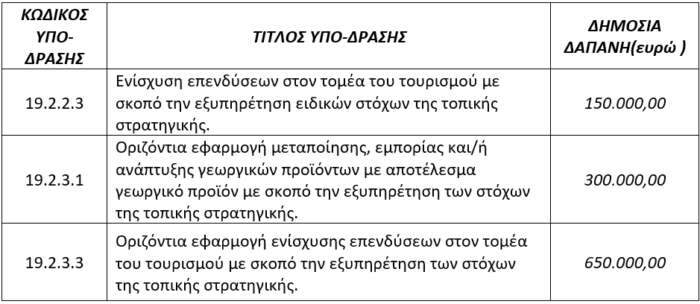 Η Συγχρηματοδοτούμενη Δημόσια Δαπάνη της τρέχουσας Πρόσκλησης ανέρχεται ενδεικτικά στο ύψος του 1,1 εκατ. ευρώ. Το ύψος της επιχορήγησης υπολογίζεται βάσει των επιλέξιμων δαπανών. Το ποσοστό ενίσχυσης κυμαινεται από 50% έως 70% ανάλογα με την δράση.