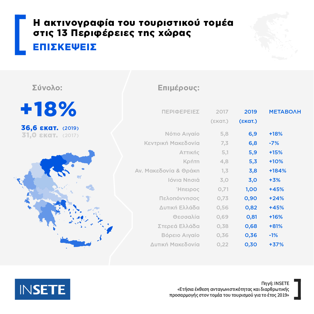 Ειδικότερα, ανά Περιφέρεια οι επισκέψεις, οι τουριστικές εισπράξεις και η μέση δαπάνη ανά επίσκεψη στην Ελλάδα και το ποσοστό μεταβολής μεταξύ 2017 και 2019 διαμορφώθηκαν ως εξής: