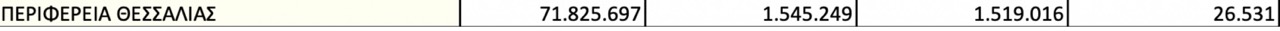 Σε ότι αφορά την Περιφέρεια Θεσσαλίας έχει ταμειακά διαθέσιμα 71.825.697 ευρώ, απλήρωτες οφειλές 1.545.249, εκκρεμούν 1.519.016 και ληξιπρόθεσμα στα 26.531 ευρώ.