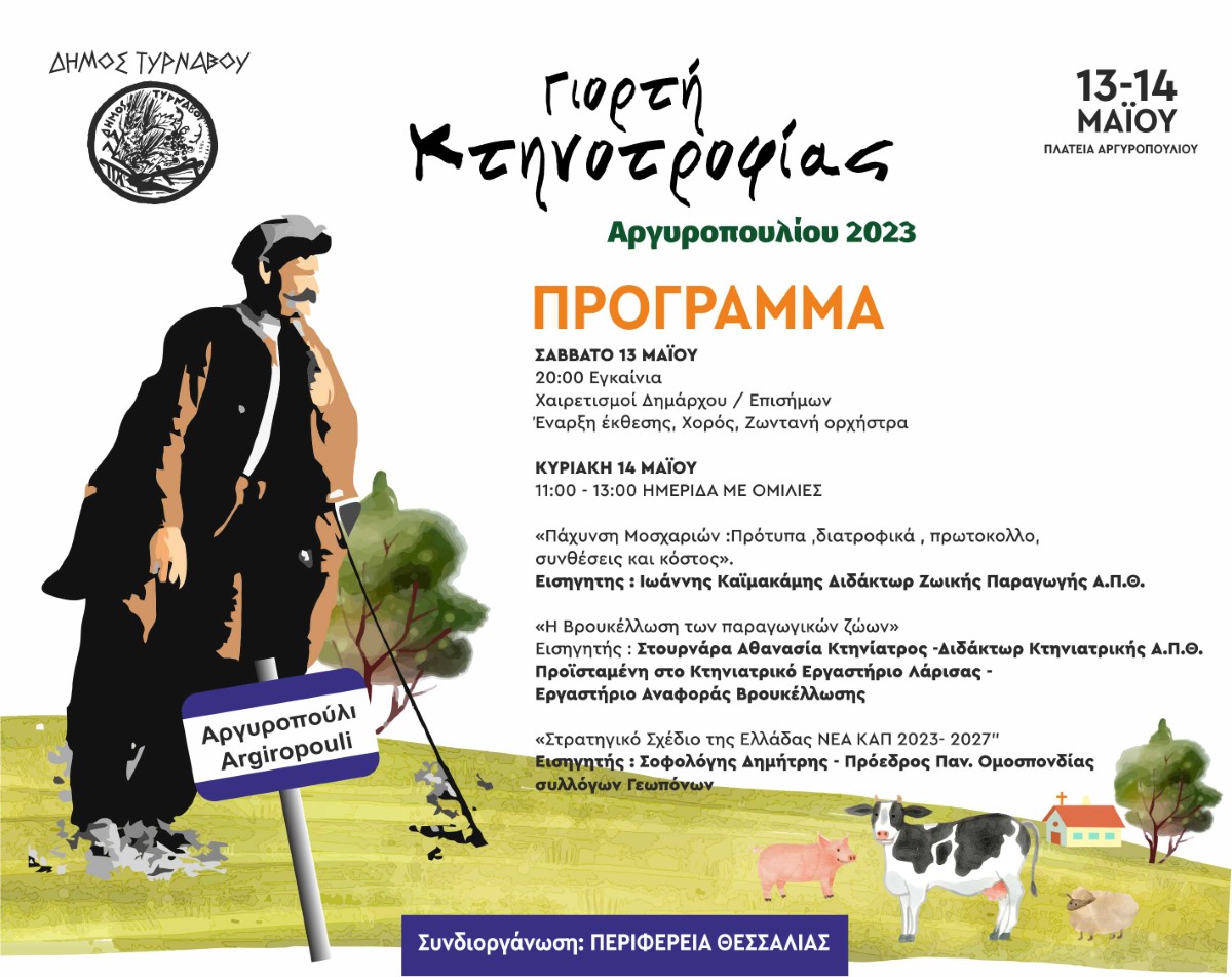 Ο Δήμος Τυρνάβου διοργανώνει την γιορτή κτηνοτροφίας στο Αργυροπούλι το Σαββατοκύριακο 13 & 14 Μαΐου 2023. Η γιορτή διοργανώνεται στην πλατεία Αργυροπουλίου, σε συνεργασία με την Περιφέρεια Θεσσαλίας και την υποστήριξη των τοπικών Συλλόγων.
