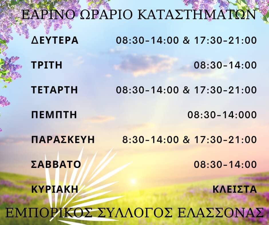 Από τον Εμπορικό Σύλλογο Ελασσόνας ανακοινώνεται το προτεινόμενο εαρινό ωράριο λειτουργίας των καταστημάτων- μελών για το 2024 το οποίο θα εφαρμοστεί από την Δευτέρα 1 Απριλίου 2024.