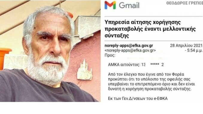 Έκανα όμως και αίτηση για χορήγηση προκαταβολής έναντι μελλοντικής σύνταξης και πήρα την απάντηση ότι “δεν είναι δυνατή η χορήγηση προκαταβολής σύνταξης επειδή το υπόλοιπο της οφειλής υπερβαίνει το επιτρεπόμενο όριο”.