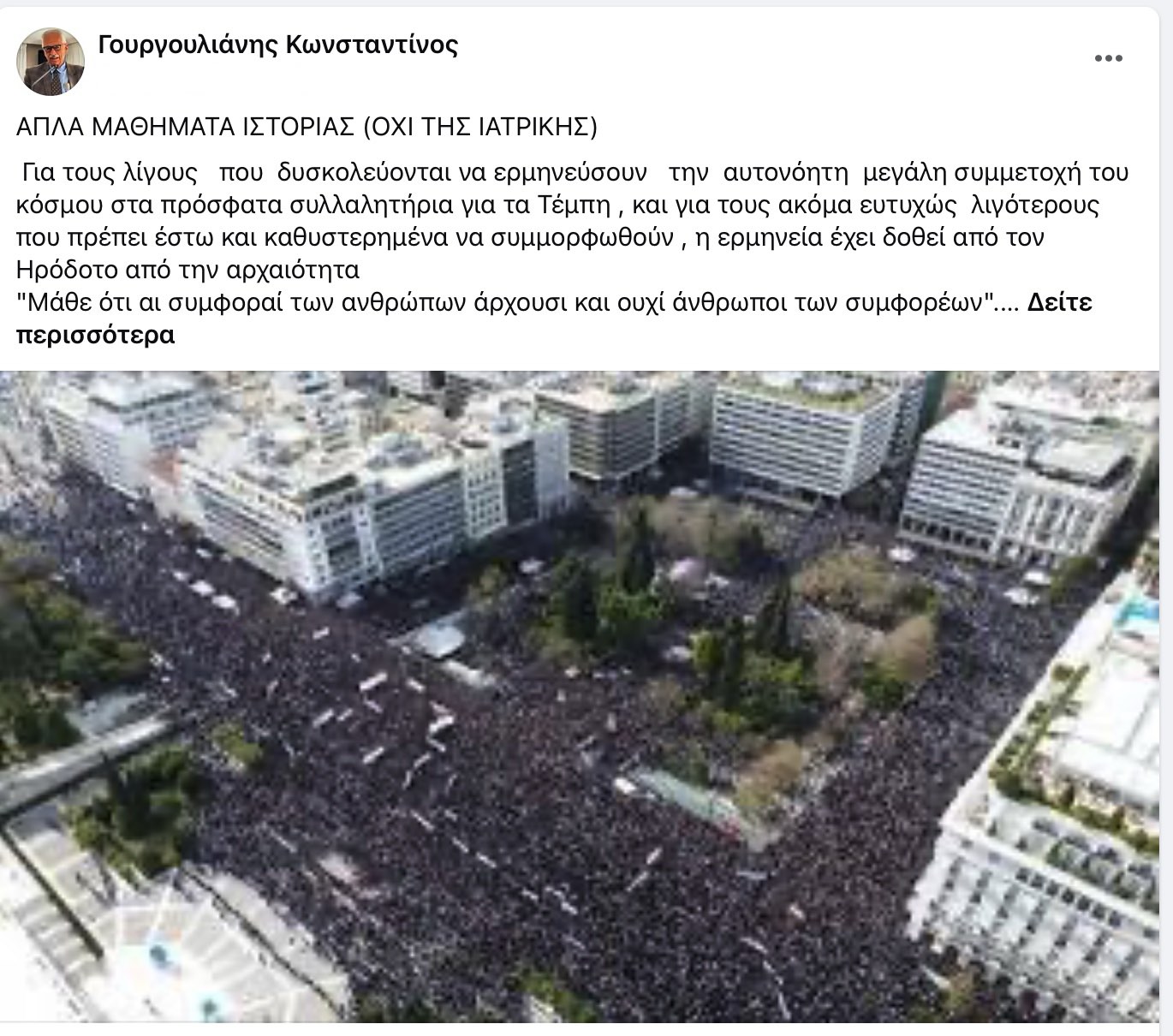 Για τους λίγους που δυσκολεύονται να ερμηνεύσουν την αυτονόητη μεγάλη συμμετοχή του κόσμου στα πρόσφατα συλλαλητήρια για τα Τέμπη , και για τους ακόμα ευτυχώς λιγότερους που πρέπει έστω και καθυστερημένα να συμμορφωθούν , η ερμηνεία έχει δοθεί από τον Ηρόδοτο από την αρχαιότητα.