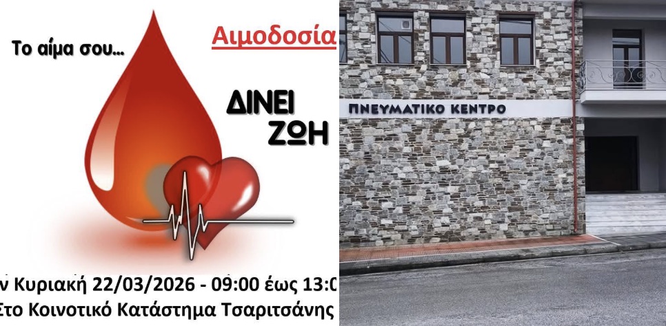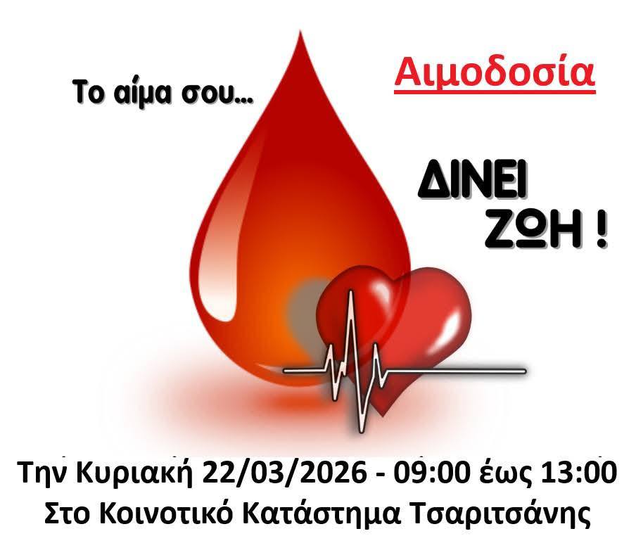Την Κυριακή 22/03/2026 θα πραγματοποιηθεί η 72η Αιμοδοσία του Συλλόγου Αιμοδοτών Τσαριτσάνης και από 09:00 έως 13:00.