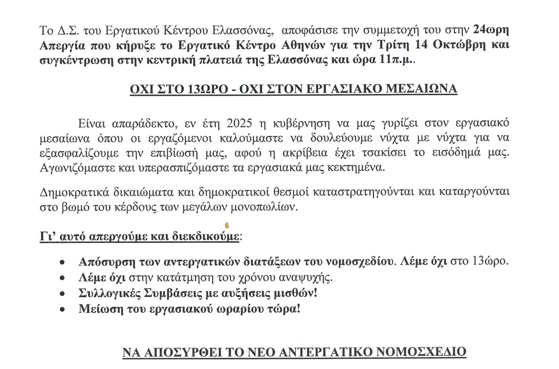 Ανακοίνωση κάλεσμα του Εργατικού Κέντρου Ελασσόνας στην αυριανή απεργία