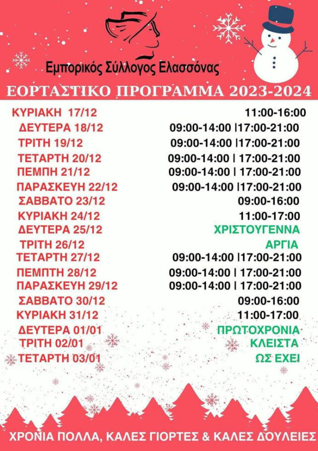 Το ωράριο των καταστημάτων στην Ελασσόνα για σήμερα είναι 11 π.μ. με 4 μ.μ.