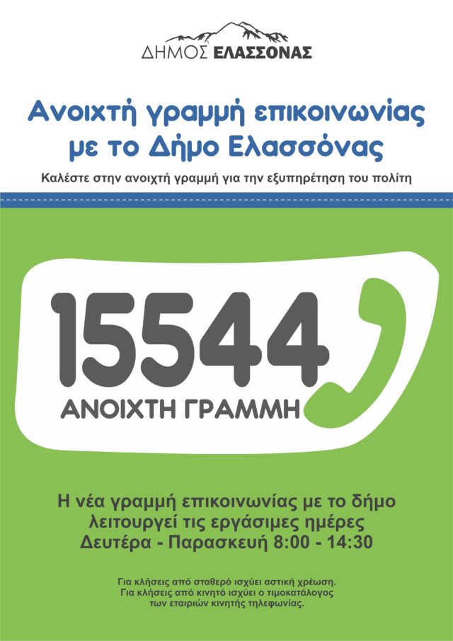 Ο Δήμος Ελασσόνας ενημερώνει τους δημότες ότι η Ανοιχτή Γραμμή Επικοινωνίας παραμένει σε πλήρη λειτουργία, προσφέροντας ένα άμεσο και αποτελεσματικό κανάλι επικοινωνίας μεταξύ πολιτών και δημοτικής αρχής.